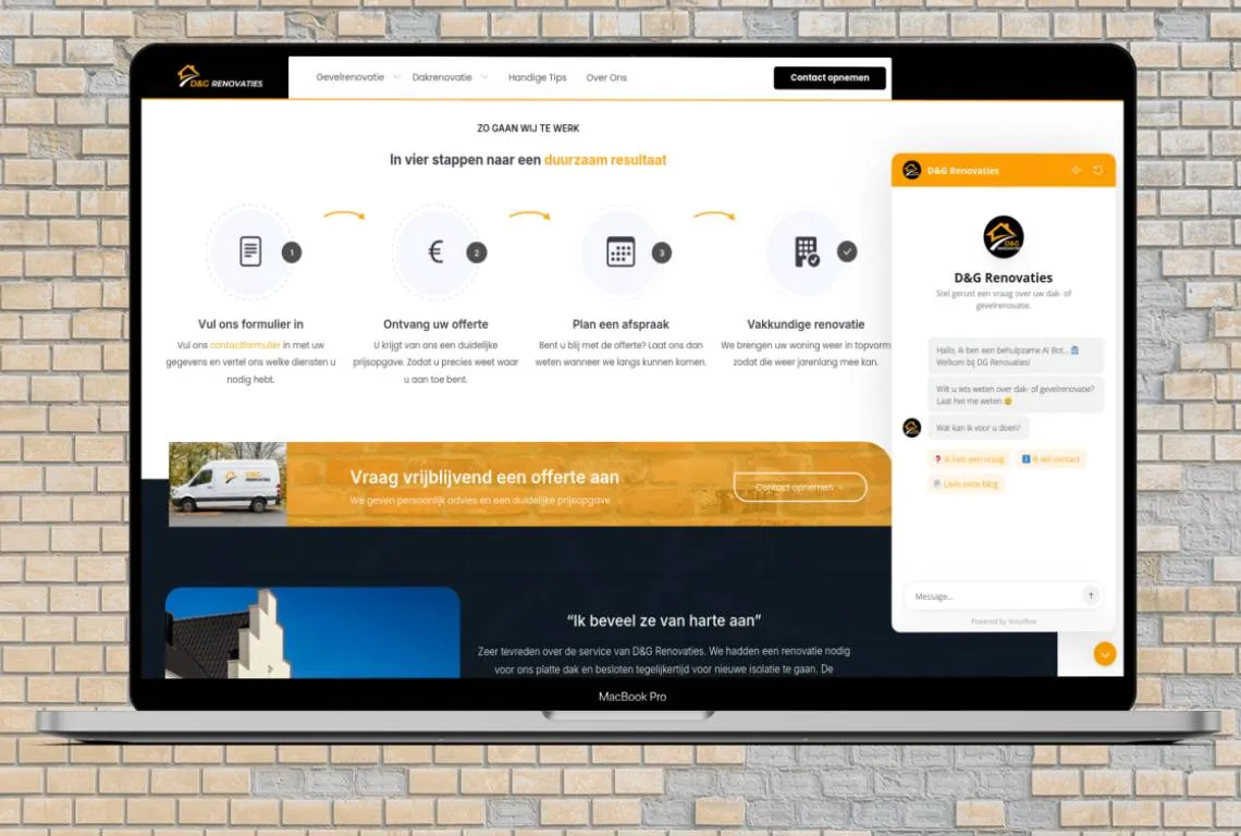 DG Renovaties sought a powerful online presence to showcase their high-quality facade and roofing renovation services. We delivered a custom website designed for lead generation, optimized for performance and SEO, ntegrated with a custom AI chatbot for scalable customer service, and directly integrated with their CRM. Beyond the website, we implemented a targeted digital strategy to increase their local visibility and attract new clients.