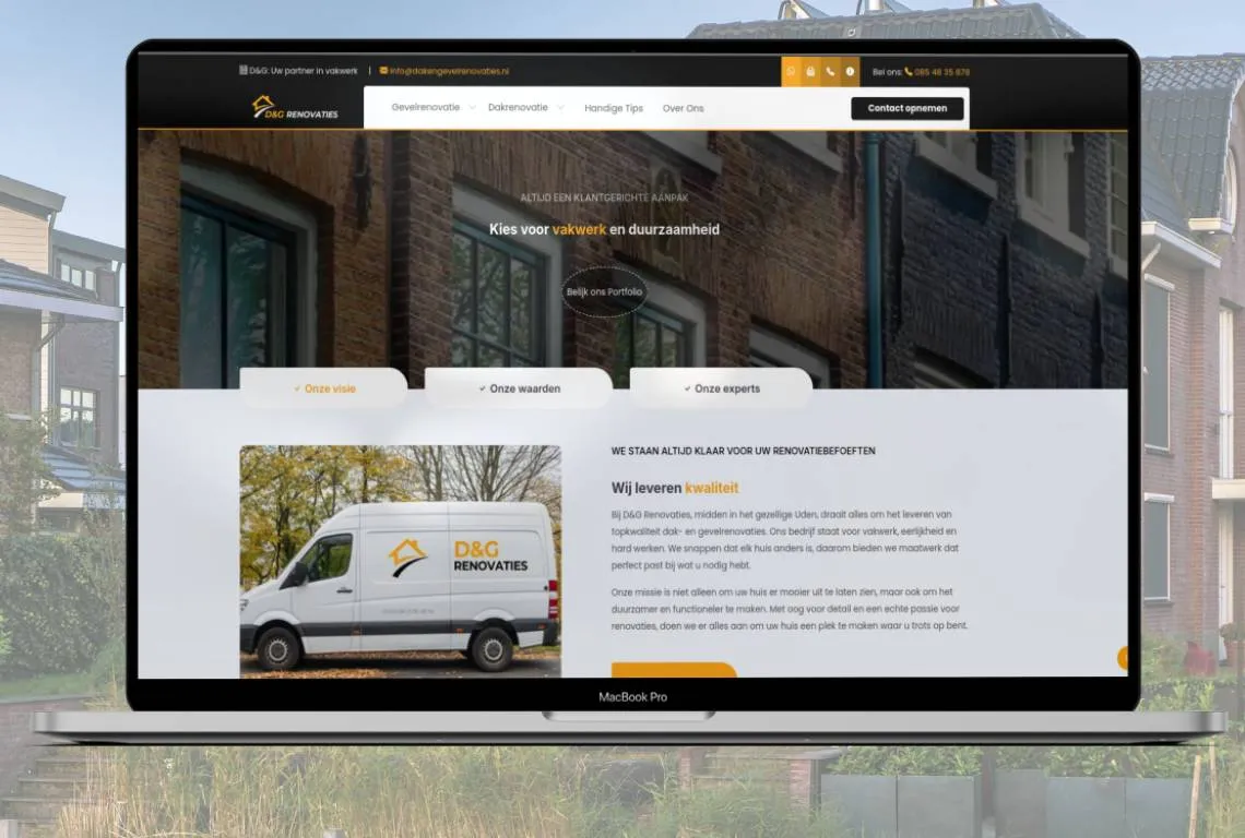 We crafted a high-performance website for DG Renovaties using Nuxt and Vue.js, designed to capture leads, showcase their expertise in facade and roofing renovations, and provide scalable customer service with a custom-built AI chatbot. Key features include a sleek design, a project portfolio, seamless CRM integration, and the AI chatbot.